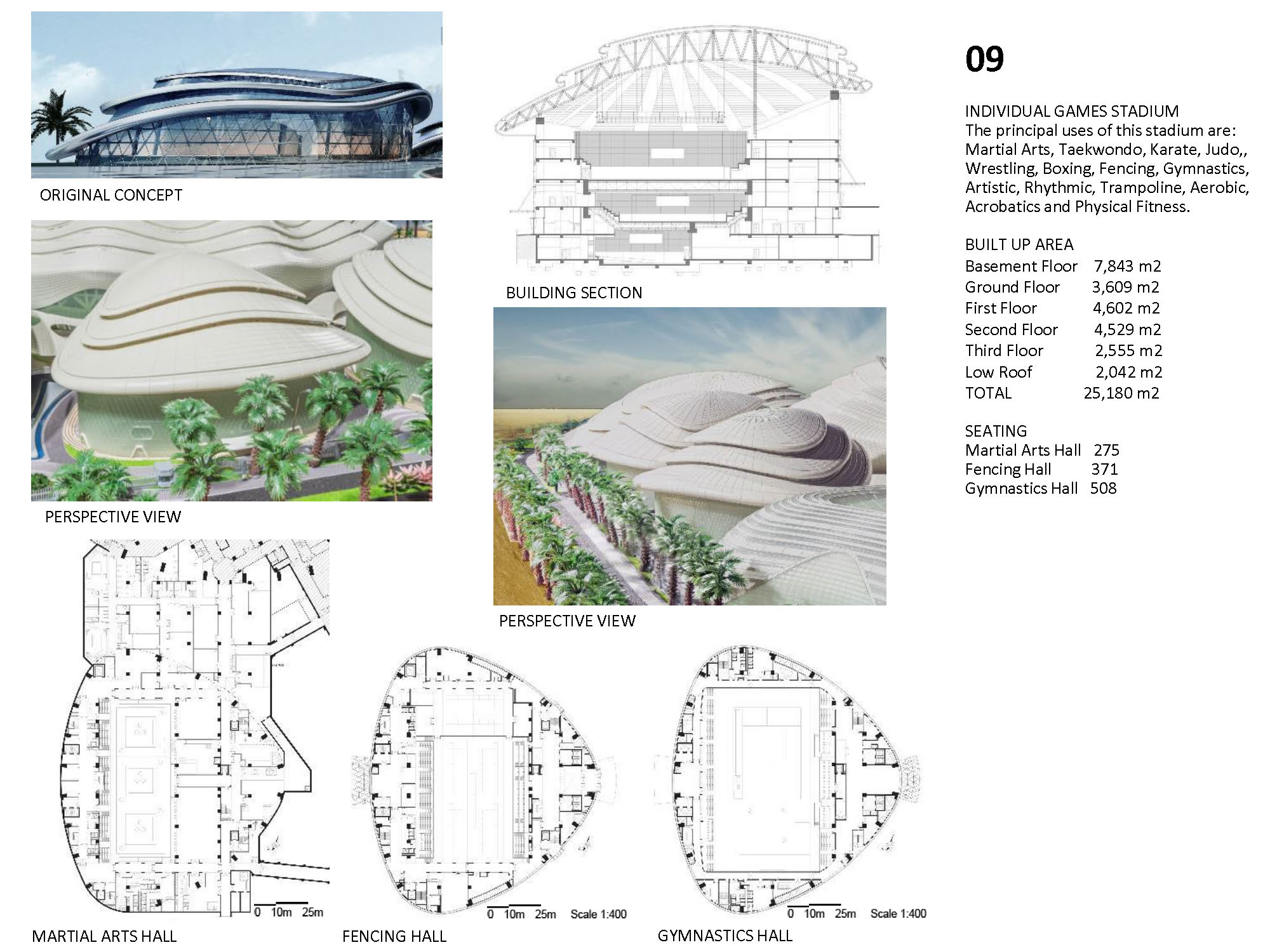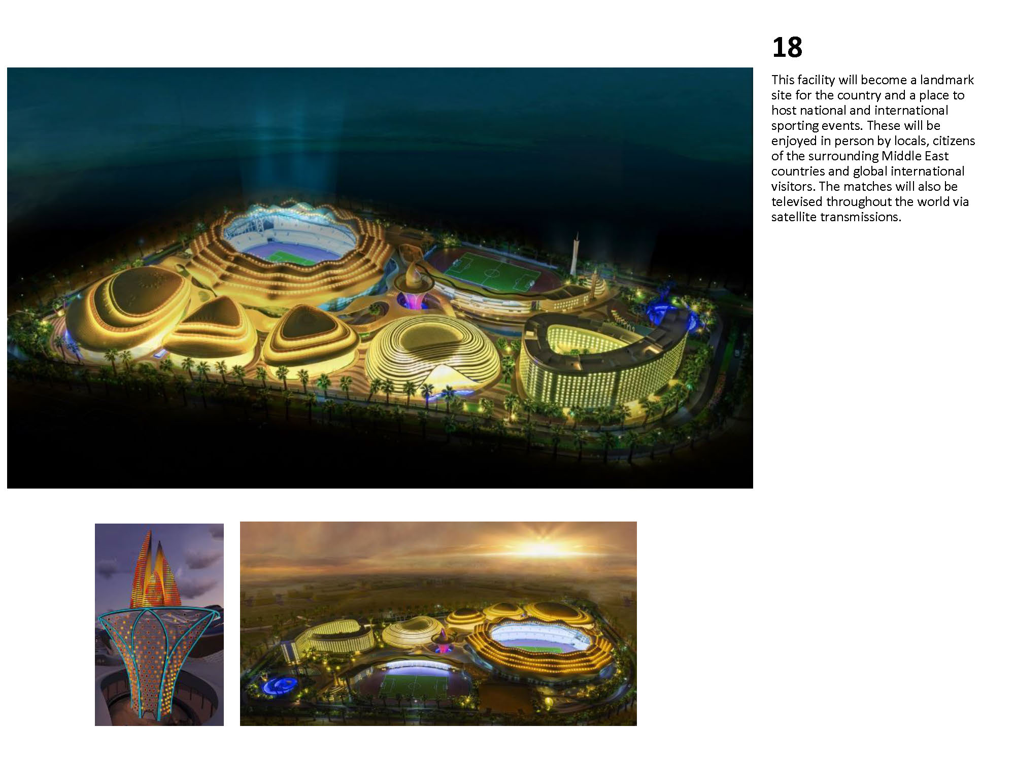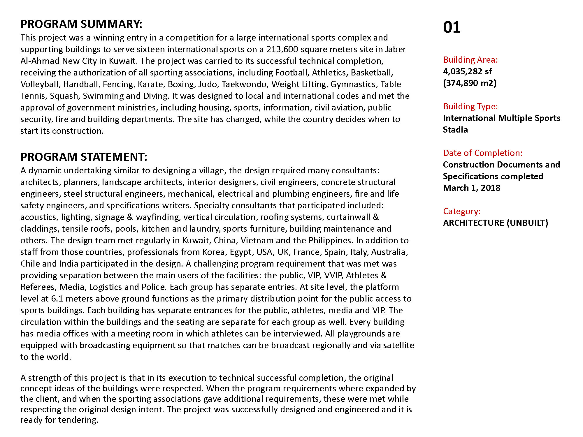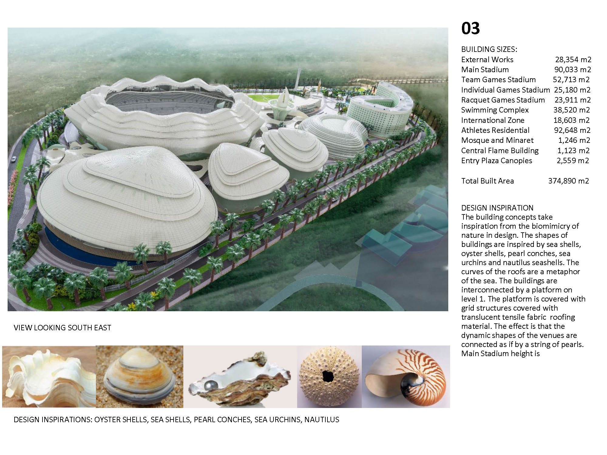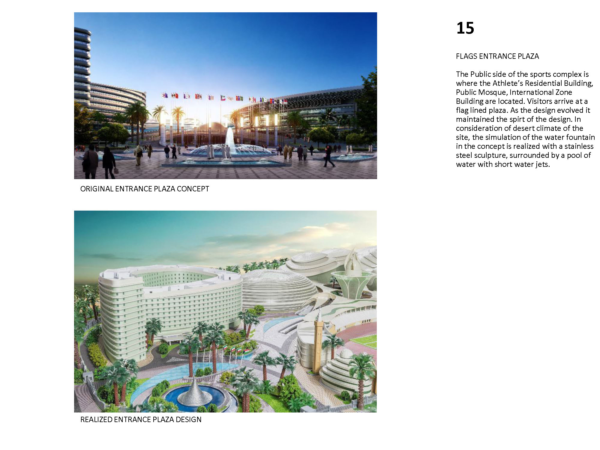 The Kuwait Olympic Village is a self-supporting village that will be an international sporting events center, capable of hosting up to 16 sports for national, regional, and global sporting events. The concept design uses beaches, shells and desert oasis as concepts, which inspires the landscape design. The design integrates function with nature and local culture. The concept is represented by different landscape elements all over the site, such as wavy fence, wavy paving pattern, spiral sculpture, and streamlined planting areas. It is manifest in shell-like appearance of large stadiums, and in the sails-like wavy roofs providing shade. The design also provides a variety of use areas for shopping, recreation, and gathering after game events. The project also includes substantial facilities for media services, police, public observation decks, as well as a public mosque. Among the buildings featured in the village are the following: Main Buildings: • Football Stadium • Olympic Swimming Complex • Team Sports Stadium • Individual Games Stadiums • Athletics Track & Field Stadium • Racquet Games Stadiums Support facilities: • Athletes’ Residences • International Committee Center • Police Station • Public Mosque • Observation Tower with rotating café • Ticket Offices & Village Entrances • Central covered circulation spine